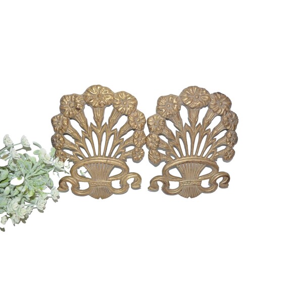 Vtg Art Nouveau Morning Glory Brass Wall Floral Ribbon French Style 2 pc pair Decor