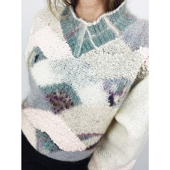 | Characteristics of goods | Circa 1980’s. Please see approximate measurements to ensure accurate fit. Stand-up collar, full-length sleeves, cinched waist and cuffs. No flaws or defects to note. Vintage Intarsia Patterned Hand-Knit Sweater Shoulders: 19”Bust: 20”Waist: 17”Length: 24”Sleeve Length: 22”Tagged size L. Size LVintage hand-knitted sweater in intarsia motif pattern.44% Mohair Wool27% Cotton19% Nylon7% Wool3% RayonExcellent pre-owned vintage condition. Manufactured by Lauren Hansen. Features various textiles and textures in soft, pastel hues. | ||