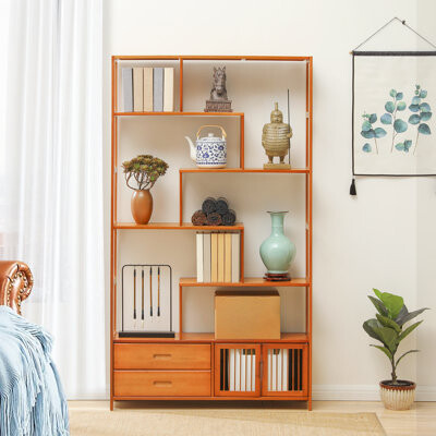- Home & Living > Furniture > Latitude Run Bamboo 5-Shelf Bookcase With 2 Drawers Vintage Staggered Shelf Organizer For Home Office & Living Room Bookcases & Cabinets
